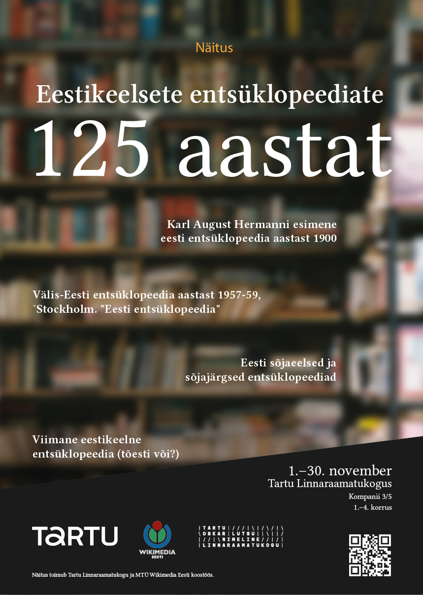 Novembrikuus avatakse Tartu Linnaraamatukogus (Kompanii 3/5) näitus “Eestikeelsete entsüklopeediate 125 aastat”, mis tutvustab eestikeelsete entsüklopeediate arengulugu alates 1900. aastast kuni tänapäevaste digiprojektideni. Näitus on avatud 1.–30. novembril raamatukogu kõigil neljal korrusel.