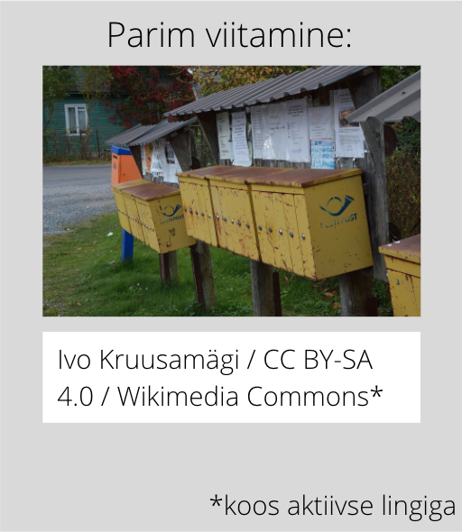 Võtame näiteks selle foto postkastist ja kirjakastidest Alajõe külas, mida on korduvalt Eesti ajakirjanduses kasutatud. Siin tuleb välja tuua, et foto autor on Ivo Kruusamägi ja pilt on kasutatav CC BY-SA 4.0 litsentsi all. Kui on soovi nimetada ka keskkonda, siis see on Wikimedia Commons (mitte Vikipeedia, Wikipedia ega Wikipeedia). Samas ei ole keskkonna mainimine nõutav. Tavakasutusel annab Commonsi keskkonna mainimine aga hästi edasi mõtet, et pilt on vikisüsteemist ja järelikult vabalt kasutatav, ning sellisena võib seda tinglikult lugeda ka samaväärseks litsentsi esitamisega. Ühtlasi annab see teada, et kust võib huviline pildi leida, mis on oluline informatsioon.